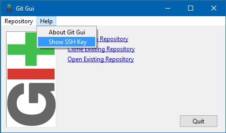 After installing Git, you need to execute Git GUI from Git folder in start menu. To generate a key, just open the Help menu and select Show SSH Key.